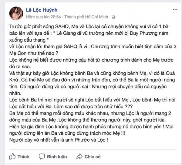 Qua sự việc này, Duy Phước và Lê Lộc cũng lên tiếng mong mọi người thôi chỉ trích ba mẹ của ḿnh v́ đó đă là chuyện quá khứ và bây giờ ai cũng có cuộc sống riêng.