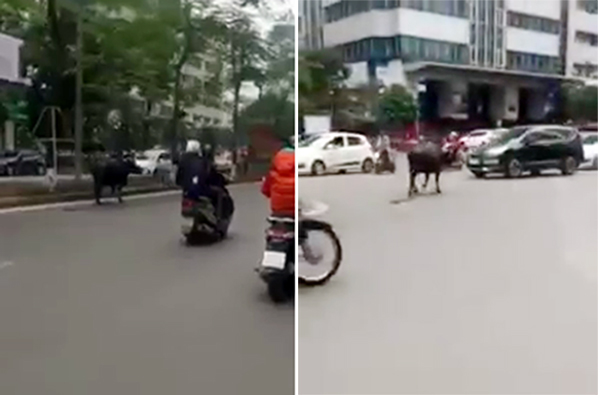 Một con trâu bất ngờ xuất hiện trên đường phố Hà Nội khiến người đi đường được phen náo loạn.