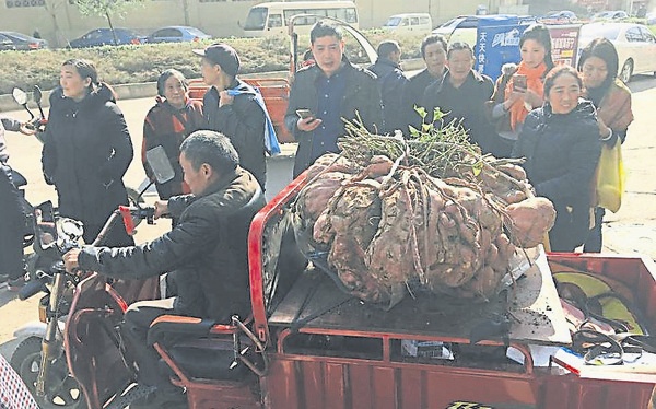 Ông Cheng Yuezheng ở Thai Châu, Chiết Giang đã trồng được củ khoai lang nặng 41 kg. Khi củ khoai được dỡ lên từ đất, quá to khiến mọi người không tin mắt mình.