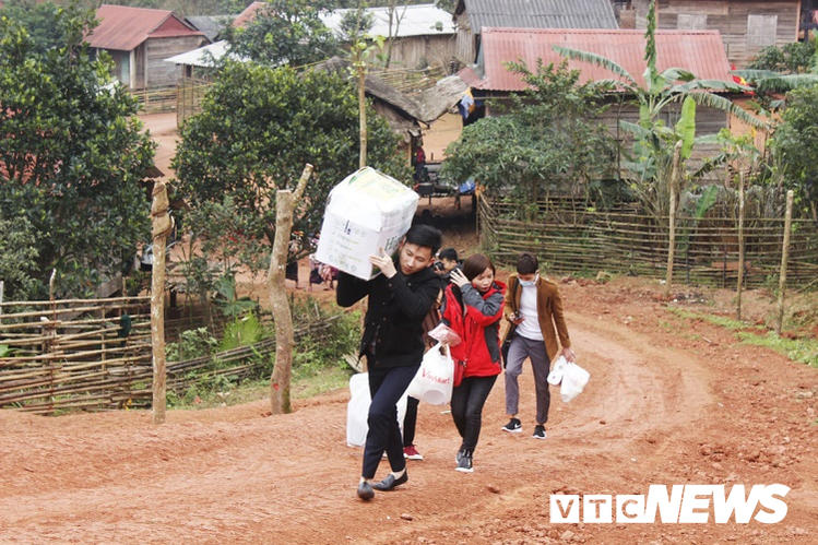 Nhóm tình nguyện vượt đường sá xa xôi, cách trở để mang áo ấm và chăn đến cho những trẻ em Ma Coong tránh rét. (Ảnh: Trần Anh)