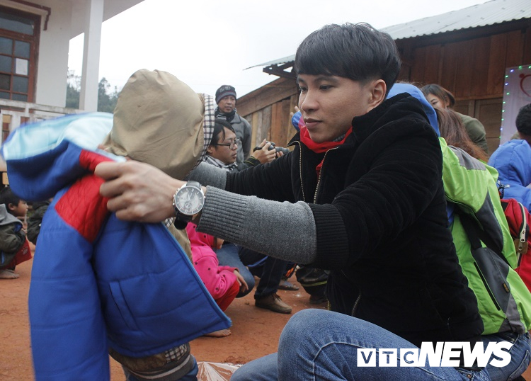 Tự tay mặc áo ấm cho những trẻ em người Ma Coong. (Ảnh: Trần Anh)