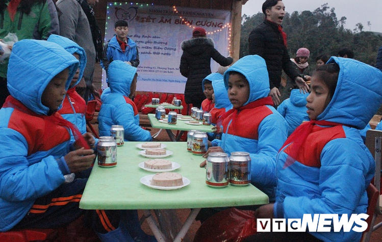 Những em nhỏ vùng cao khoác bộ quần áo ấm và được ăn bữa ăn có giò và nước ngọt. (Ảnh: Trần Anh)