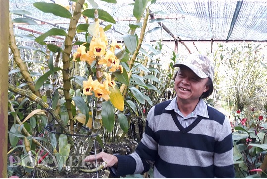 Ông Phạm Quang Bình bên giò lan dendrodium mùa xuân đang nở hoa vàng rực.
