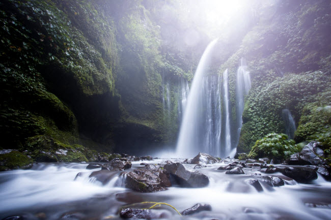Nước của thác Sendang Gile và Tiu Kelep chảy xuống vách núi cao 45m trên đảo Lombok ở Indonesia.