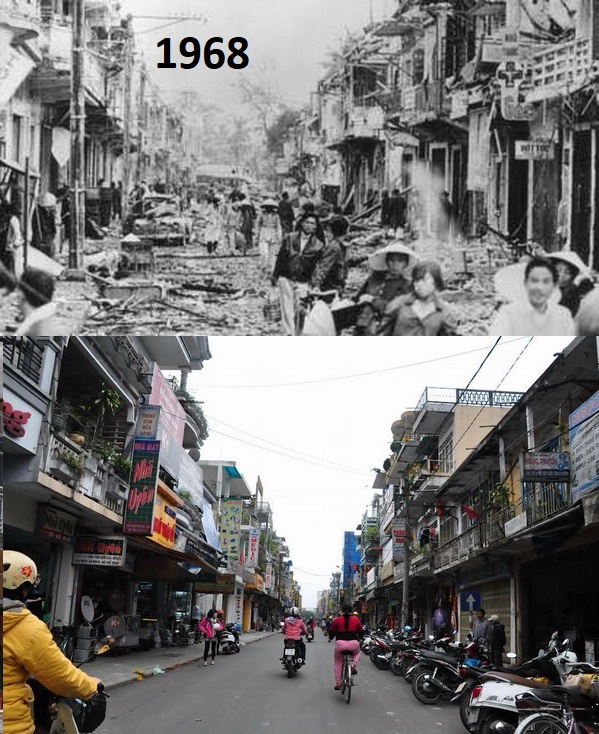 Tết Mậu Thân 1968 ... Như bao địa điểm khác ở Huế phải gánh chịu thê lương , phố Ngã giữa - Phan Bội Châu bị tàn phá nghiêm trọng, thiệt hại nặng nề ...