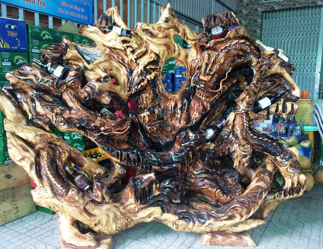 Người có con mắt nghệ thuật nauỳ đã vào cầu to. Chuyện là trong một lần anh Toàn đi tìm mua gỗ vụn, vô tình anh phát hiện gốc me tây "khủng" có hình dáng lạ. Anh ngắm đi ngắm lại thấy có hình hai con rồng uốn lượn quanh gốc cây. Vậy à anh quyết định mua và thuê hai người thợ đến tác chế thành tác phẩm "song long tranh châu" độc đáo.