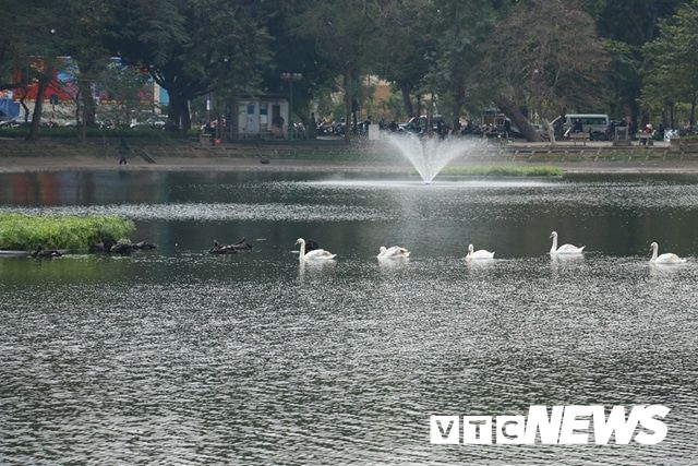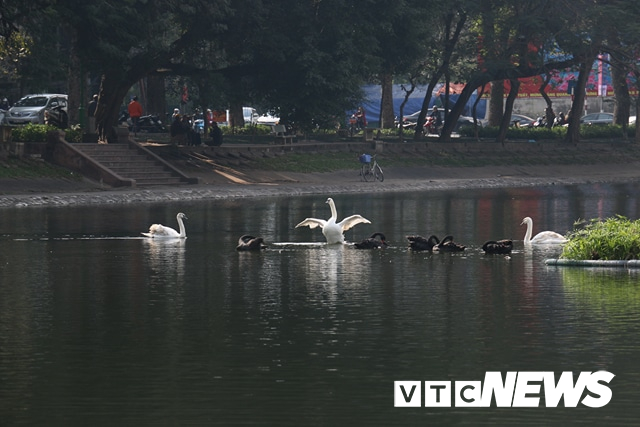 Sáng 6/2, nhiều người dân Hà Nội ngạc nhiên khi thấy đàn thiên nga ở Hồ Gươm đang tung tăng bơi lội ở hồ Thiền Quang.