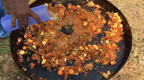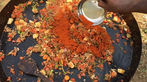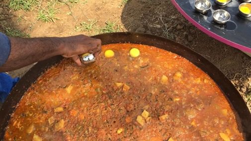 Sau khi cho tất cả nguyên liệu vào trong chiếc chảo khổng lồ, cà ri sẽ là nguyên liệu được trộn vào cuối cùng.