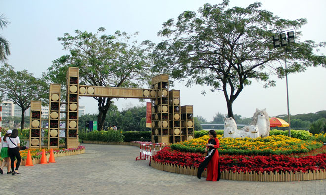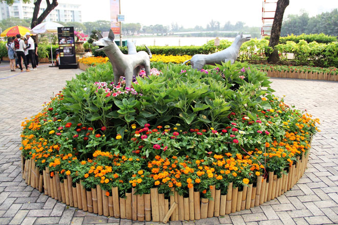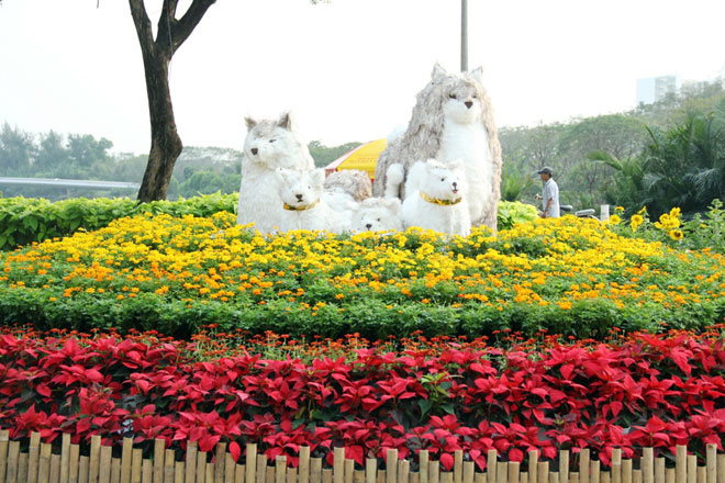 Hình ảnh linh vật của năm Mậu Tuất được dựng tại khu vực cổng của hội hoa xuân ở “khu nhà giàu”