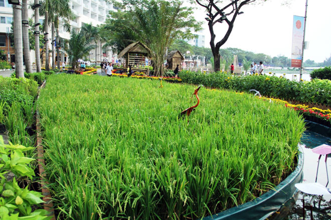 Những cánh đồng lúa, những con đường mòn ở ruộng lúa, mái nhà tranh…rất làng quê được tái hiện ở hội hoa xuân. “Nhìn hình ảnh cánh đồng lúa với những người rơm tôi nhớ nhà quá. Tết này tôi không về nên cũng buồn”, chị Nguyễn Quỳnh Trang ngụ quận 7 chia sẻ.