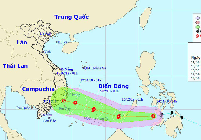 Dự báo trong 24 đến 48 giờ tiếp theo, bão di chuyển theo hướng Tây Tây Bắc, mỗi giờ đi được khoảng 15km. Đến 1h ngày 16/2, vị trí tâm bão ở vào khoảng 10,0 độ Vĩ Bắc; 113,3 độ Kinh Đông, cách đảo Trường Sa (thuộc quần đảo Trường Sa) khoảng 220km về phía Đông Bắc. Sức gió mạnh nhất ở vùng gần tâm bão mạnh cấp 8 (60-75km/giờ), giật cấp 11.