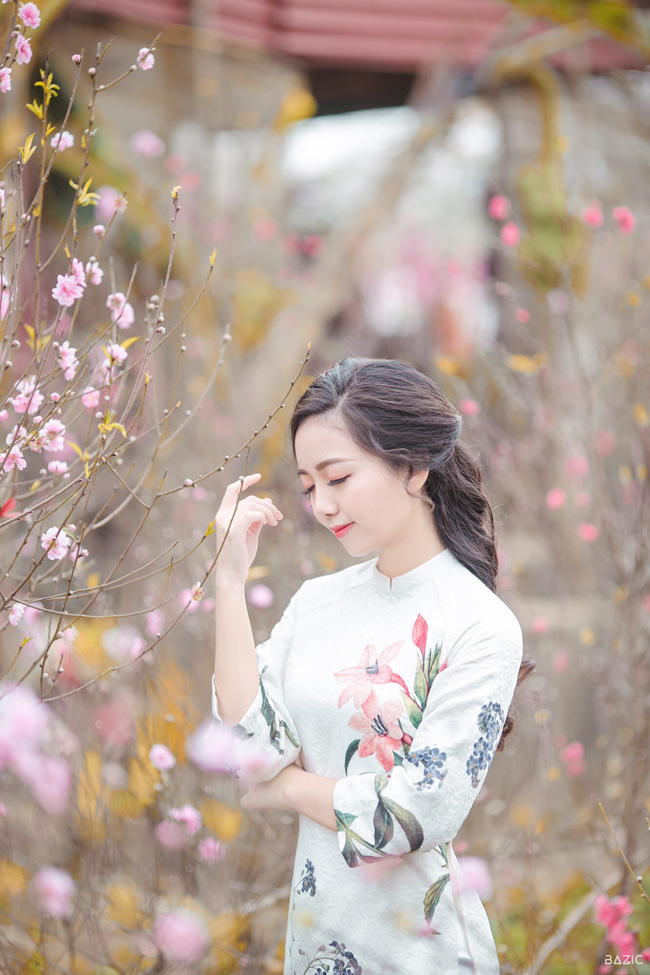 Cô giáo trẻ diện áo dài trắng in hoa, nổi bần bật giữa vườn đào đang khoe sắc.