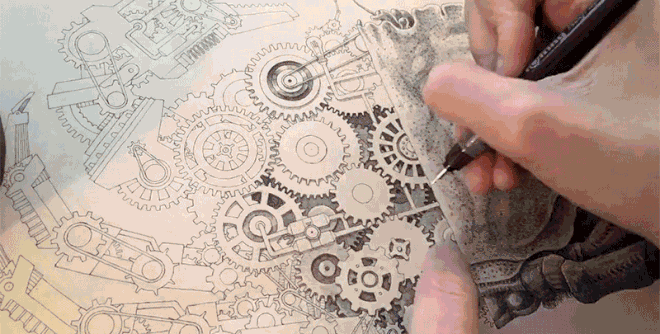 Hoạ sĩ Steenven Salvat từng tạo nên một tác phẩm mới rất độc đáo với tên gọi “Cancer Gigalain”, tái hiện lại biểu tượng con cua trong cung cự giải rất ấn tượng. Một nửa bức tranh sẽ là con cua bình thường rất chân thật. Nửa còn lại sẽ cho bạn thấy những gì bên trong con cua đặc biệt này, không phải… thịt, mà là hệ thống bánh răng phức tạp, cực kỳ chi tiết, được anh vẽ chính xác như máy in.