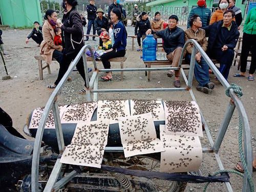 Ngoài ra, người dân còn mang nhiều tấm dính chứa đầy ruồi, nhặng đến đặt trước cổng nhà máy này để phản đối việc gây ô nhiễm.