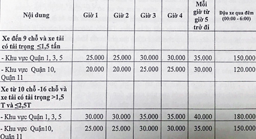 Trong đề án, Sở GTVT TP.HCM xây dựng mức phí áp dụng cho hai nhóm gồm: ô tô đến 9 chỗ, xe tải dưới 1,5 tấn và nhóm ô tô từ 10 chỗ, xe tải trên 1,5 tấn đến dưới 2,5 tấn. Mức phí giữ xe ô tô cũng được tính tăng lũy tiến theo giờ chứ không tính giá giữ xe theo lượt như hiện hành.
