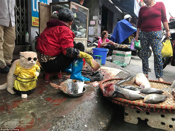 Chú mèo này được đưa tới quầy bán hải sản sau khi anh Phong nhận được lời mời của chủ quầy. Các bức ảnh "Chó" đứng bán cá mau chóng lan rộng sau khi anh Phong đăng nó lên Facebook và Instagram.