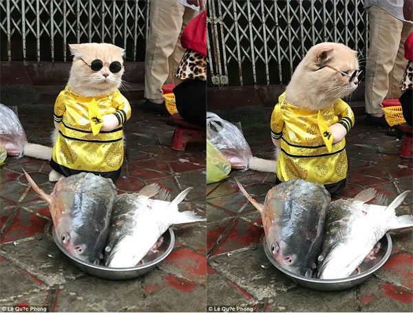 Vietbf.com - Nhiều dân mạng nước ngoài trên mạng xã hội rất thích thú hình ảnh một chú mèo mặc đồ hoàng đế, đứng bên cạnh một quầy bán cá mực ở Hải Phòng đáng yêu bỗng chốc trở thành ngôi sao trên mạng xã hội.