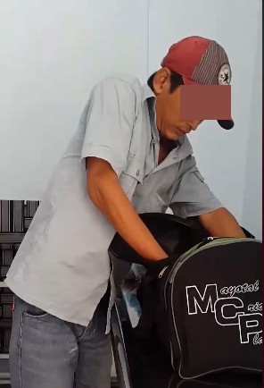 Hình ảnh người cha bỏ thi thể con vào giỏ xách.