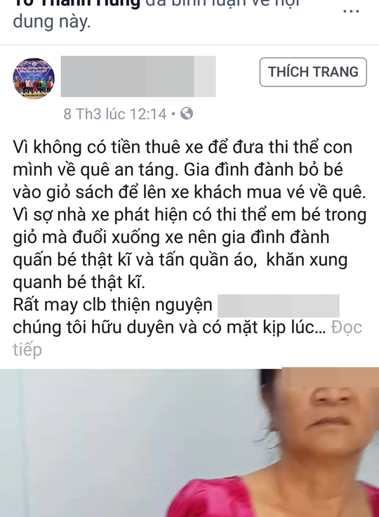 Vì sợ nhà xe phát hiện có thi thể bé trong giỏ mà đuổi xuống xe nên gia đình đành quấn bé thật kỹ và tấn quần áo, khăn xung quanh bé thật kỹ…". Ngay khi đoạn clip dài hơn 2 phút này xuất hiện, đã có 29.000 lượt (yêu, thích, khóc), 26.000 lượt chia sẻ và hơn 1,7 triệu lượt xem. Rất may, nhóm thiện nguyện ở TP HCM đã kịp thời đến hỗ trợ toàn bộ chi phí cho gia đình để có điều kiện chuyển thi thể đứa bé về quê lo hậu sự.