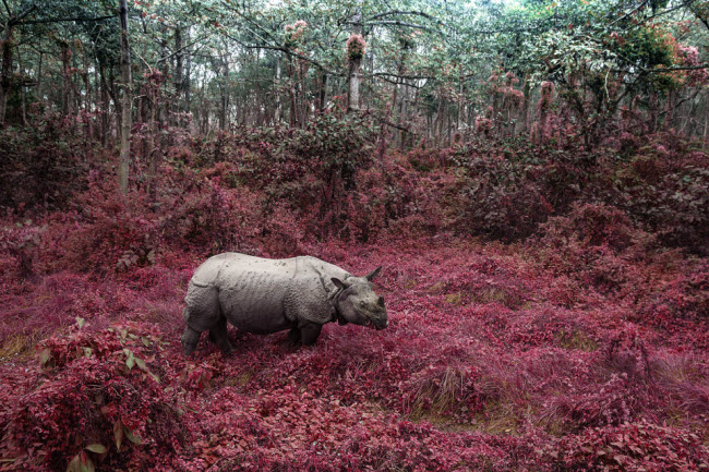 Tê giác đi trên bãi cỏ màu hồng trong vườn quốc gia Chitwan ở Nepal. Ảnh: Tanya Sharapova