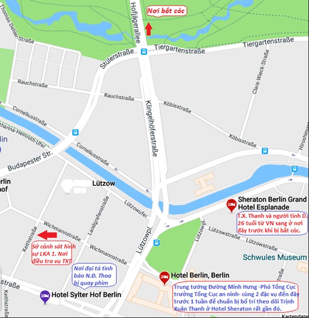 Điểm đáng lưu ý, khách sạn “Berlin, Berlin” nơi Trung tướng Đường Minh Hưng trú ngụ chỉ cách khách sạn Sheraton khoảng 100 mét. Chi tiết này cho thấy tình báo Việt Nam đã biết trước nơi lưu trú của cô Đỗ Minh Phương, nên Trung tướng Hưng đã chọn khách sạn gần đó, rất thuận lợi cho việc theo dõi và giám sát.