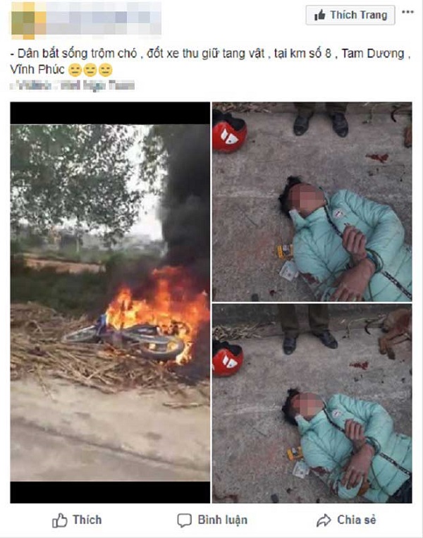 Khi thanh niên này đã bắt được 2 con chó thì bị người dân phát hiện. Thanh niên bỏ chạy thì bị người dân truy hô và bắt giữ, hành hung. Không chỉ vậy, một số người dân quá khích còn châm lửa, đốt rụi xe của “cẩu tặc”.