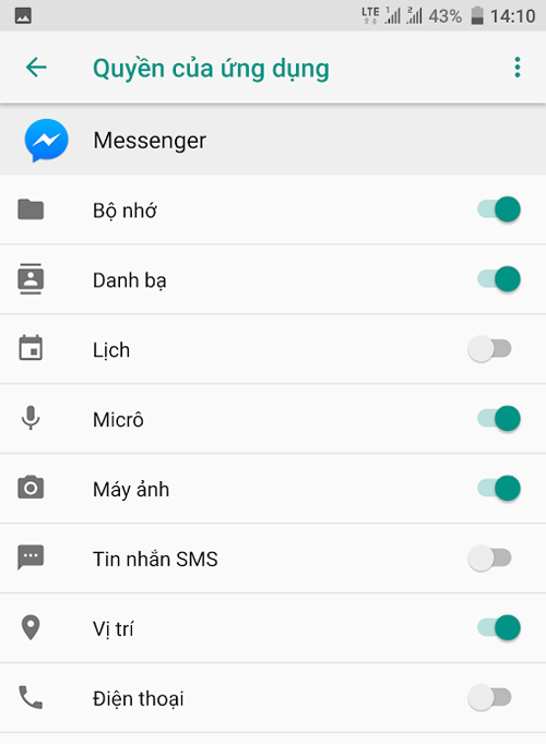 Ứng dụng Messenger dù chỉ để nhắn tin và gọi qua mạng nhưng vẫn dùng rất nhiều quyền truy cập. Phần mềm này cũng đòi hỏi quyền truy cập cả Điện thoại và Tin nhắn và đều cần tắt.