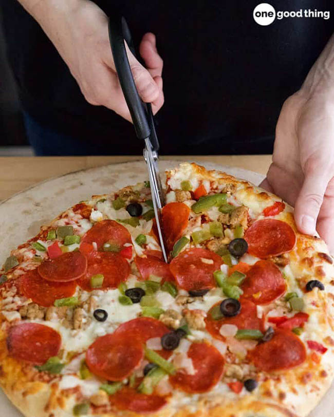 Bạn có thể sử dụng một cái kéo hoặc con dao để cắt bánh pizza, thay vì tốn tiền mua dụng cụ cắt pizza chuyên dụng.