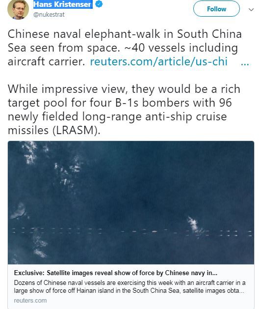 Vietbf.com - Một công ty Planet Labs đã đăng tải hình ảnh vệ tinh cho thấy 40 tàu chiến Trung Quốc với tàu sân bay Liêu Ninh thật hoành tráng ồ ạt di chuyển xuống phía Nam, khiến chuyên gia Mỹ Hans Kristensen cho rằng, hạm đội tàu hoành tráng của Trung Quốc chỉ là mục tiêu dễ dàng của 4 máy bay ném bom B-1 với 96 tên lửa LRASM .