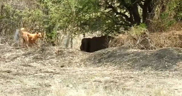Mặc dù con chó nhỏ hơn voi rất nhiều, nó vẫn dũng cảm sủa lớn để đuổi voi đi. Cuối cùng con voi phải quay đầu bỏ cuộc.