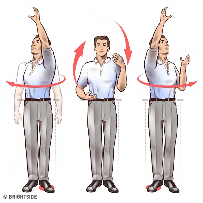 Khi thực hiện, bạn đứng thẳng, xoay nhẹ người sang 1 bên rồi giơ 1 tay cao lên như đang hái hoa quả rồi thu tay về ngang vai và quay người sang bên kia thực hiện tương tự.