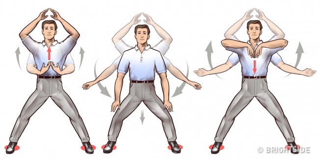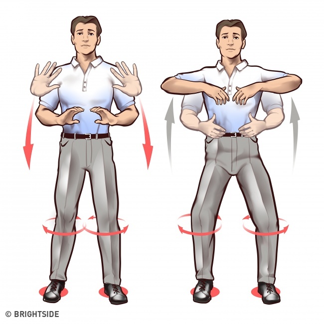 Để thực hiện, bạn mở 2 chân bằng vai, bàn tay xòe ra và để ngang vai rồi từ từ hạ tay xuống phần eo và tiếp tục giơ tay ngang vai. Lặp lại bài tập này 8 lần một hiệp rồi nghỉ.