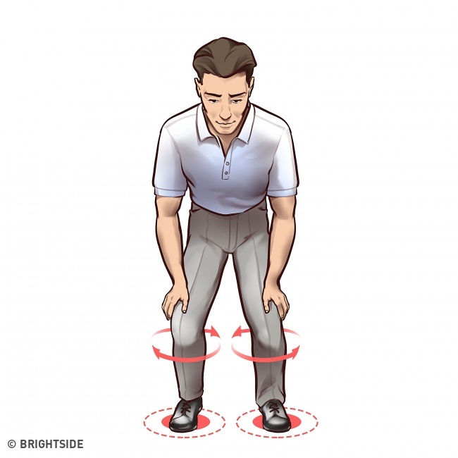 Cách thực hiện: Đứng cúi người và đặt 2 tay vào đầu gối rồi bắt đầu xoay khớp đầu gối theo vòng tròn. Lặp lại nhiều lần khi thực hiện.
