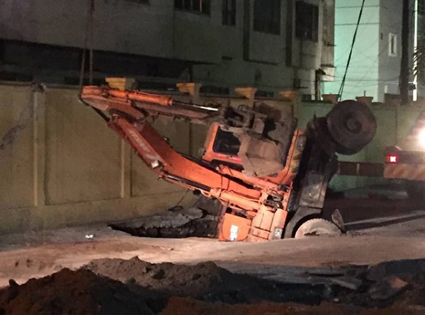 Máy xúc được điều đến hiện trường để khắc phục hậu quả cũng bị "hố tử thần" nuốt luôn (ảnh bạn đọc cung cấp)