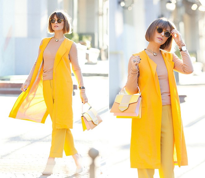 Sau vài bước đơn giản, hẳn bạn đã làm chủ được vòng tròn màu. Bạn đã biết kết hợp một đôi giày cao gót màu chanh chói mắt cùng bộ quần yếm xanh nước biển. Tuy nhiên, trong một vài trường hợp, bạn cần vẻ ngoài dịu và ôn hòa hơn. Chẳng hạn, bạn thích những bộ trang phục rực rỡ nhưng chúng lại không hợp mắt sếp. Khi đó, bạn có thể chọn phương án trung hòa bằng cách chỉ nhấn vào 1 màu duy nhất. Nhấn màu trên nền trung tính như đen, xanh nước biển hay màu kem.