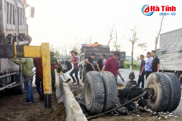 Lưu thông với tốc độ cao từ Hồng Lĩnh ra Nghệ An, khi đến địa phận Nghi Xuân (Hà Tĩnh), chiếc xe tải bất ngờ nổ lốp trước rồi va vào giải phân cách cứng khiến chiếc xe hư hỏng nặng, giao thông ùn tắc cục bộ.