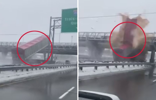 Daily Mail đã đăng tải một video cho thấy chiếc xe tải đã phóng rất nhanh trước khi va chạm. Trong khi đó, thùng hàng lại bị nâng quá cao khiến khi va chạm, thùng hàng vỡ tan tành. Tai nạn kinh hoàng này xảy ra trên một tuyến đường cao tốc ở Quebec, Canada. Rất may không có ai bị thương trong vụ việc. Đường cao tốc sau đó bị đóng cửa 20 tiếng để dọn dẹp.