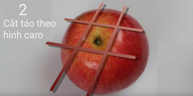 Sau đó, chị cắt theo chiều dọc, cách phần lõi táo một ít. Lặp lại tương tự với mặt bên kia, không cắt phạm vào lõi táo. Sau đó, chị để hai phần vừa cắt vào vị trí cũ. Tiếp tục cắt theo chiều dọc, cách lõi vài centimet, vuông góc với hai lát cắt đầu tiên. Quả táo giờ đã đã được cắt thành nhiều miếng nhỏ và miếng trung tâm chính là lõi táo.