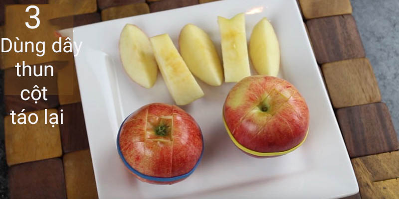 Sau khi cắt có thể kết hợp dùng nước cốt chanh hoặc nước muối xịt lên phần thịt quả rồi mới cột dây thun sẽ giúp táo tươi ngon đến hơn 8 tiếng đấy.