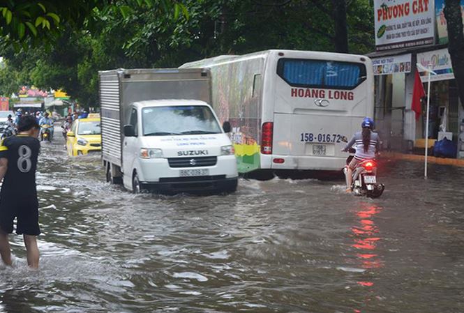 Theo ghi nhận của phóng viên, tuyên đường Trần Hưng Đạo ngập sâu 30cm. Do là ngày nghỉ lễ nên một số tuyến đường chính đã kẹt cục bộ.