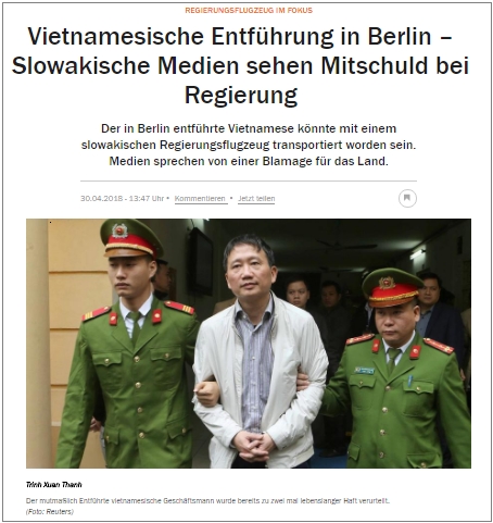Hôm 30.04.2018 tờ Handelsblatt, một nhật báo Đức chuyên về kinh tế, đăng một bài báo với tựa đề „Chuyên cơ của chính phủ trong tâm điểm – Báo chí truyền thông Slowakia thấy Chính phủ đồng lõa“ và chạy hàng tít phụ „Người Việt bị bắt cóc ở Berlin có thể đã được vận chuyển bởi một máy bay của Chính phủ Slovakia. Các phương tiện truyền thông Slovakia nói đây là một sự ô nhục cho đất nước“. Sau đây là bản dịch bài báo của tờ Handelsblatt: