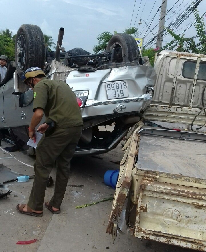 Hậu quả, chiếc ôtô bị lật ngửa, nhiều người trong ôtô la hét thất thanh. Đuôi ô tô bị lật đè lên chiếc xe tải nhỏ đậu ven Quốc lộ.
