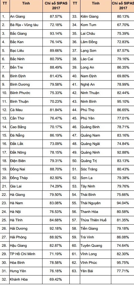 Cũng theo kết quả khảo sát, đánh giá về cải cách hành chính 2017 thì chỉ số hài lòng về sự phục vụ hành chính của tỉnh cao nhất là 95,75%, tỉnh thấp nhất là 67,70% và giá trị trung bình là 79,76%. Nửa số tỉnh trong cả nước có chỉ số hài lòng về sự phục vụ hành chính nằm trong khoảng 79,76 - 95,75% và nửa số tỉnh có chỉ số nằm trong khoảng 67,70 - 79,76%.