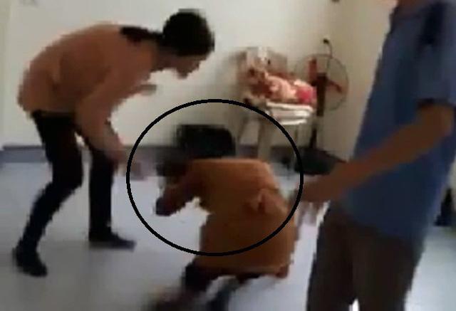 Trưởng nhóm tà đạo (khoanh tròn) bị chị H. xô xát đẩy ngã xuống nền nhà. Ảnh: Cắt từ clip