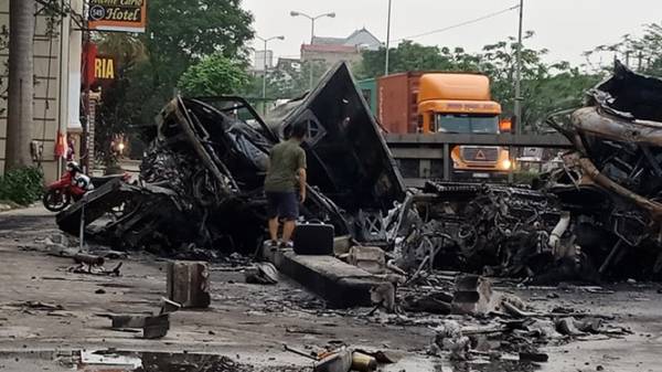 Theo thông tin ban đầu, 2 xe container đang lưu thông trên đường Nguyễn Bỉnh Khiêm theo hướng từ cầu vượt Big C xuống cảng Chùa Vẽ, thì bất ngờ 1 xe bị mất lái, va chạm với xe chạy cùng chiều. Cú va chạm mạnh khiến 2 xe vỡ nát, cùng bốc cháy dữ dội.