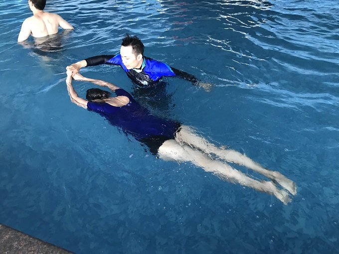 2 buổi đầu, mọi việc diễn ra suôn sẻ, nữ học viên tuy sợ nước nhưng khi học chị tỏ ra dạn dĩ, xuống bể học không một chút e dè.