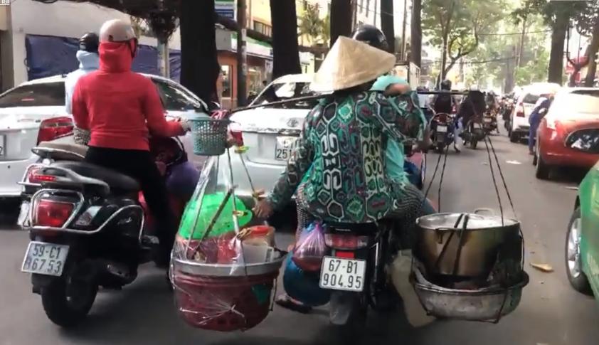 Trong clip, một người phụ nữ ngồi sau xe máy với chiếc quang gánh một bên là bếp than đỏ rực cùng nồi nước dùng sôi sùng sục nghi ngút khói... Chiếc xe chở "nước sôi lửa bỏng" này vô tư chạy trên tuyến đường tấp nập xe cộ qua lại.