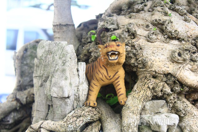 Bên dưới gốc sắp đặt thêm các tiểu cảnh và một con hổ tạo thêm sự cổ kính, kỳ bí cho cây.