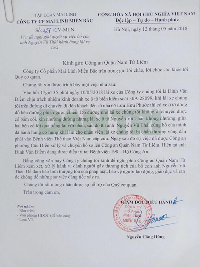 Về diễn biến sự việc, như đã đưa tin, khoảng 17h35 ngày 10/5, anh Đinh Văn Điềm (SN 1981, ở Nghĩa Hưng – Nam Định) điều khiển xe taxi Mai Linh đến khu vực số nhà 65 đường Lưu Hữu Phước (Cầu Diễn, Nam Từ Liêm – Hà Nội) để đón khách. Do đường nhỏ cộng thêm có xe ô tô hiệu Mercedes do Nguyễn Vũ Thái (SN 1987, ở Cầu Diễn, Nam Từ Liêm – Hà Nội) dừng đỗ phía trước bên đường ngược chiều nên Điềm đã bấm còi xin đường, nhưng Thái không nhường. Hai bên đã có lời qua tiếng lại, sau đó Thái cầm gạch tấn công anh Điềm dẫn đến anh này bị chảy máu ở vùng đầu.
