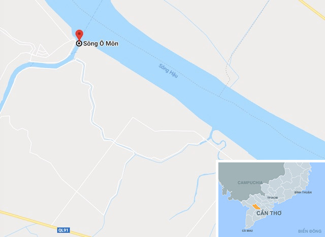 Sông Ô Môn, qua địa bàn Bình Thủy (Cần Thơ) đang xảy ra sạt lở. Ảnh: Google Maps.